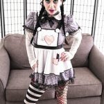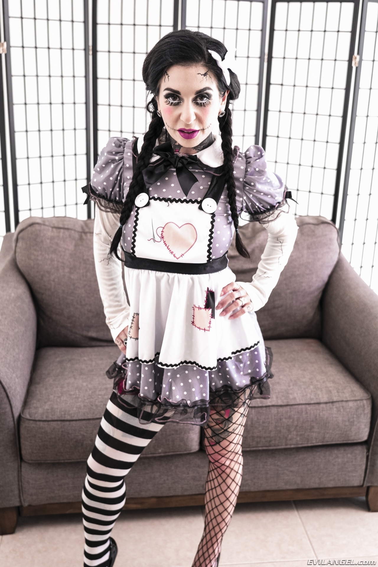 Tattooed, alt-porn MILF Joanna Angel portrays a creepy, sex-crazed fuck doll! The tattooed vixen reaches under her polka-dot skirt to finger her slit, and she fucks her asshole with a giant dildo.